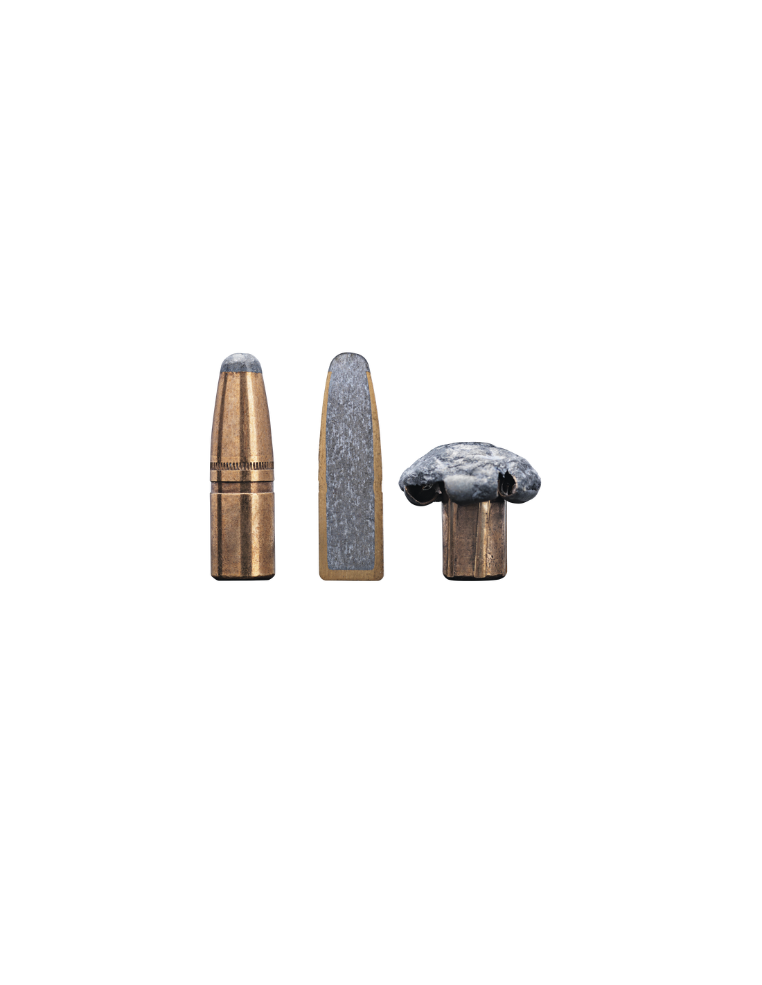 Una bala pesada encamisada y de punta blanda con un núcleo adherido. La forma y la construcción de la bala están especialmente diseñadas para evitar la separación del núcleo y proporcionar una proliferación controlada con un excelente poder de frenado. El diseño de punta redonda aumenta la velocidad de expansión y la confiabilidad.